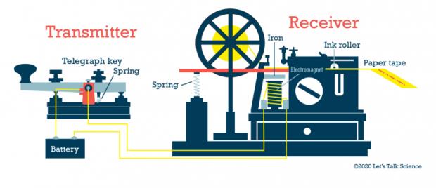 (ٹیلی گراف سسٹم کے حصے ٹرانسمیٹر اور ریسیور آئیے ٹاک سائنس کی ویب سائٹ سے) تکنیکی ترقی، ترقی پذیر ضروریات، یا زیادہ موثر متبادلات سے آگے نکل جانے کی وجہ سے پہلے کی بہت سی عظیم ایجادات اب عام استعمال میں نہیں ہیں۔ٹیلی گراف مشین ایک کلید کو دبانے پر الیکٹرک سرکٹ کو مکمل کرکے کام کرتی ہے جو پیغام کے سگنل کی ترسیل کو متحرک کرتی ہے۔ ٹیلی گراف سے پہلے، مواصلات کے ابتدائی طریقوں میں ڈرم کی دھڑکنیں، دھواں کے اشارے، جسمانی میسنجر، پوسٹل لیٹر، اور سیمفور(ہاتھ میں جھنڈے لے کر اشارے کرنا) استعمال کیا جاتا تھا۔ایک مختصر تاریخی جائزہ: ٹیلی گراف کی ترقی تک پرنٹنگ پریس مواصلات میں سب سے بڑی اختراع تھی۔ بعد میں سالوں تک بڑے پیمانے پر پیغامات کے لیے پرنٹنگ کلیدی شکل رہی، لیکن ٹیلی گراف نے انسانی تاریخ میں پہلی بار وسیع فاصلے پر فوری رابطے کی اجازت دی۔ٹیلی گراف لمبی دوری کے مواصلات کی ایک ابتدائی شکل جو تاروں پر برقی سگنل منتقل کرتی ہے، جو بعد میں ٹیلی فون اور انٹرنیٹ جیسی ٹیکنالوجیز کی بنیاد کا کام کرتی ہے۔ ٹیلی گراف کے آلات طویل فاصلے پر پیغامات بھیجتے ہیں، جسے ٹیلی گرام کہتے ہیں۔ لفظ "ٹیلیگراف" دو یونانی الفاظ سے آیا ہے۔ "ٹیلی" کا مطلب ہے "فاصلے پر اور "گراما" کا مطلب ہے "خط"۔ جب لوگ ٹیلی گراف کا حوالہ دیتے ہیں تو ان کا مطلب عام طور پر الیکٹرک ٹیلی گراف ہوتا ہے۔ لیکن پیغامات کو دوسرے طریقوں سے بھی طویل فاصلے تک بھیجا جا سکتا ہے۔ مورس نے نہ صرف ٹیلی گراف ایجاد کرنے میں مدد کی بلکہ اس نے ایک نیا مواصلاتی نظام بھی تیار کیا۔ اس نظام کو مورس کوڈ کہا جاتا تھا۔ یہ نقطوں اور ڈیشوں پر مشتمل تھا۔ نقطوں اور ڈیشوں کے مختلف مجموعے مختلف حروف، اعداد اور اوقاف کی نمائندگی کرتے ہیں۔ مورس کوڈ نے ٹیلی گراف سسٹم کے لیے پیچیدہ پیغامات بھیجنا ممکن بنایا۔مندرجہ ذیل تصویر آج مورس کوڈ کا سب سے زیادہ قبول شدہ ورژن دکھاتی ہے۔ بین الاقوامی مورس کوڈ میں، نقطے کی لمبائی ایک یونٹ ہوتی ہے۔ ایک ڈیش تین یونٹ ہے۔ ایک ہی خط کے حصوں کے درمیان خلا ایک یونٹ ہے۔ حروف کے درمیان خالی جگہ تین اکائی ہے۔ الفاظ کے درمیان خلا سات اکائیاں ہے۔ ایک ٹیلی گراف تاروں پر برقی سگنل منتقل کرکے کام کرتا ہے۔ ٹیلی گراف میں ٹرانسمیٹر اور رسیور دونوں ہوتے ہیں۔ ٹرانسمیٹر ٹیلی گراف یا ٹرانسمیشن کلید ہے۔