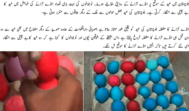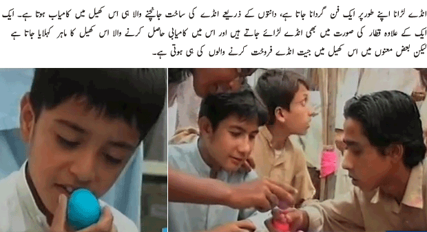 Egg Fight Game (Unda Larao): This game is played in Quetta since centuries. Two players take an egg each. While holding the egg, one strikes it with that of the other. The one whose egg cracks, loses. Normally players take an equal number of eggs and the one whose egg is cracked in the end loses the game. Before playing, the eggs are colored tastefully and the strength of an egg is checked by tapping it against the front teeth.