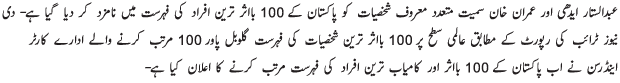 Carter-Anderson, the publishers and editors of the Global Power 100, have announced the launch of the Pakistan Power 100, a unique ranking of the most influential and successful Pakistanis across the globe. Over 33,000 nominations were received online, identifying prominent and successful Pakistanis from all walks of life, including business, sports, entertainment, philanthropy, popular arts and culture in October 2010.