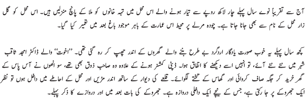 Omar Hayat Mahal is a 19th century wooden architectural wonder of Chiniot District, a in Pakistan. It is also known as Gulzar Manzil. Omar Hayat Palace is a five story building which stands in the heart of the city. Two upper stories were removed in 1993 due to heavy rainfall and storms which may have affected the adjoining buildings. It is a great tourist attraction for both local and foreign visitors.