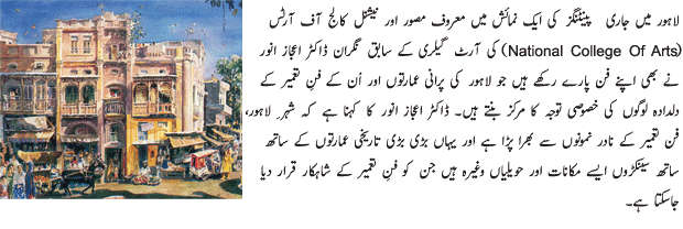 Ancient building painting exhibition in Lahore, in the historic Lahore exhibition in a well known painter and the National College of Arts of The former foreman artist Ijaz Anwar submitted his art gallery of Lahore art exhibition, its old buildings, and the art of the construction of the people forget special attention of this center.