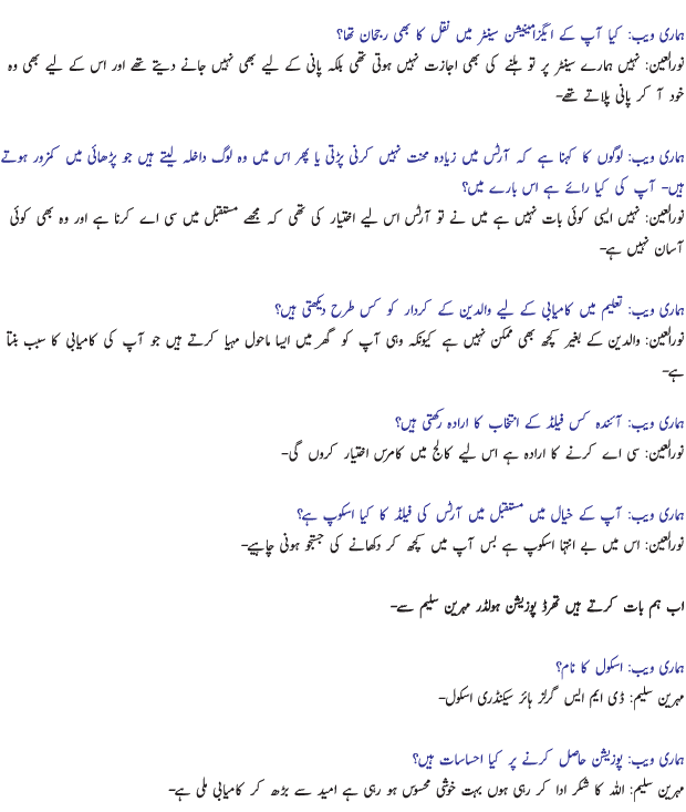 Hamariweb conducted a special interviews of Position holders students of Metric General Group of Board of Secondary Education Karachi (BSEK) 2010. Tuba Waseem, Noorulain and Mehreen Wasim are the billiant students as first, second and third position respectively. Position holders share their feeling on success, about thier teachers, education system, parents and their time table.