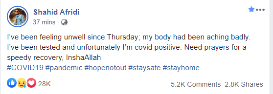 پاکستان کرکٹ ٹیم کے سابق آل راؤنڈر شاہد خان آفریدی کا کورونا وائرس ٹیسٹ مثبت آگیا۔