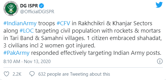 پاک فوج کی جانب سے جاری کردہ بیان کے مطابق بھارتی فوج کی جانب سے شہری آبادی کو مارٹر گولوں اور راکٹ سے نشانہ بنایا گیا ہے، جس کے نتیجے میں ایک شہری شہید جبکہ دو خواتین سمیت تین افراد زخمی ہوئے ۔