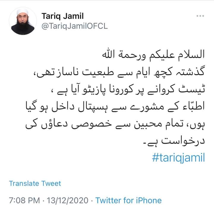 وہیں اب معروف عالم دین و مذہبی اسکالر مولانا طارق جمیل میں کووڈ انیس کی تصدیق سامنے آگٸی ہے۔