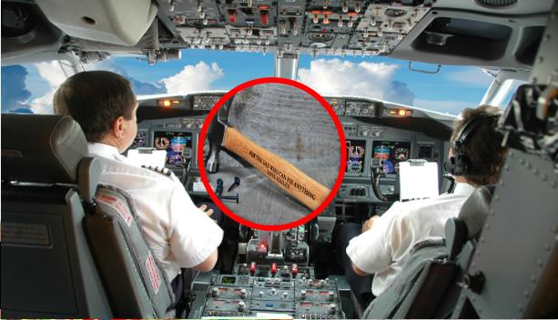 جہاز کے اندر ہتھوڑا موجود ہونے کی وجہ یہ ہے جس جگہ مسافر بیٹھتے ہیں وہاں دو جانب اندر داخل ہونے اور اندر سے باہر جانے کا راستہ ہوتا ہے مگر جس جگہ پائلٹ بیٹھتے ہیں وہاں سے باہر جانے کا صرف ایک دروازہ ہو تا ہے جو کہ مسافروں کے حصے میں جا کر کھلتا ہے ۔