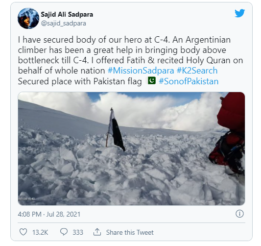 علی سدپارہ کے کھو جانے کی خبر نے پوری قوم کو عشکبار کیا،اور یوں 5 ماہ بعد ان کی لاش کی تصدیق ہونا اور ملنا پاک فوج کی ایک بڑی کامیابی ہے۔ لیکن لاش تو مل گئی اب پہاڑوں سے نیچے کیسے لائی جائے، اس کے لئے علی سدپارہ کے بیٹے ساجد سدپارہ نے ایک بڑا اہم کارنامہ انجام دیا۔