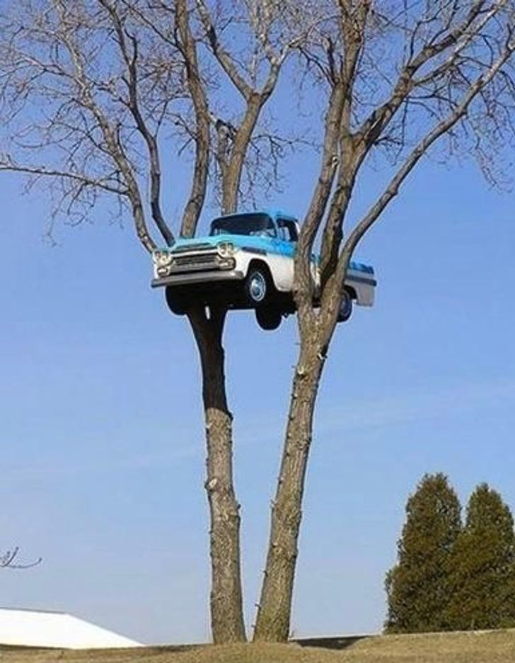 کیا یہ گاڑی اُڑ رہی تھی جو اتنے اونچے درختوں کے درمیان میں پھنس گئی؟ زرا سوچیں یہ کیسے ممکن ہے آخر یہ گاڑی ان درختوں کے بیچ کیسے پھنسی ہوگی۔