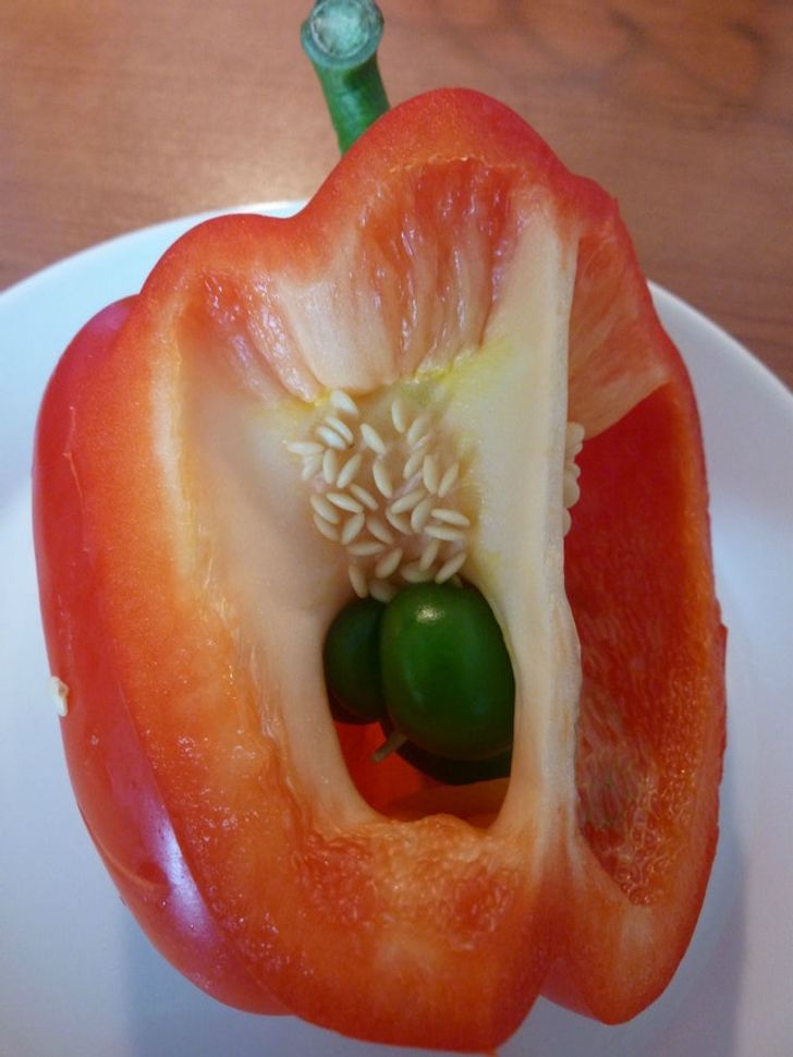 یہ تصویر دیکھیں اس میں ایک شملہ مرچ کو کاٹا گیا تو اس کے اندر ایک اور اگتا ہوا شملہ مرچ موجود ہے وہ بھی ہرے رنگ کا جبکہ یہ شملہ مرچ لال ہے۔