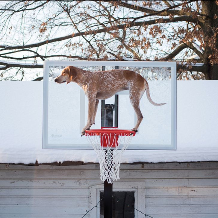 آپ بھی یہی سوچ رہے ہیں نہ کہ یہ کُتا باسکٹ بال کی باسکٹ کے اوپر کیسے پہنچ گیا اور کس قدر بیلنس کے ساتھ کھڑا ہے جیسے روز اس کا یہی کام ہو۔