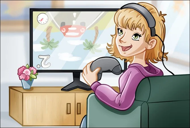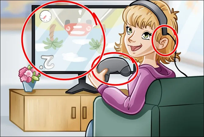تصویر میں آپ دیکھ سکتے ہیں ایک لڑکی گھر میں بیٹھ کر ٹی وی پر ویڈیو گیم کھیل رہی ہے جس کا کنٹرولر لڑکی کے ہاتھ میں ہیں جب کہ گیم میں آنے والی آوازیں سننے کے لیے لڑکی نے اپنے سر پر ہیڈ فون بھی لگایا ہوا ہے۔