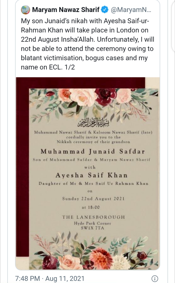 ٹوئٹر پر مریم نواز نے اپنے صاحبزادے جنید کی شادی کا کارڈ شیئر کرتے ہوئے کہا ہے کہ میرے بیٹے جنید صفدر کا نکاح 22 اگست کو عائشہ سیف الرحمن سے لندن میں ہوگا، لیکن بدقسمتی سے میں نکاح میں شرکت نہیں کر سکوں گی۔ میرے خلاف جھوٹے کیسز بنائے گئے اور میرا نام ای سی ایل میں بھی شامل کیا گیا۔