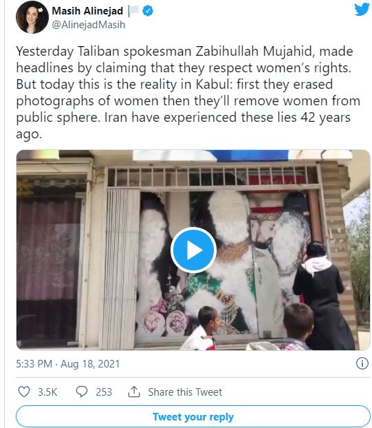 ان ٹوئٹس میں ایک ٹوئٹ کابل شہر کی شاہراہِ نو سے لی گئی ہے جس میں طالبان کو ماڈلز کے پوسٹر کو سفید رنگ سے رنگتے ہوئے دیکھا جا سکتا ہے۔