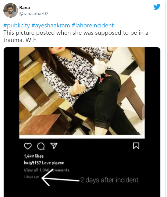 صارفین نے پہلا سوال یہ کیا کہ جس دن یہ واقعہ پیش آیا اسی روز ایف آئی آر کیوں نہیں درج کروائی گئی۔ صارفین نے دوسرا سوال یہ اٹھایا کہ 14 اکست کو پیش آنے والے واقعے کے اگلے روز عائشہ اکرم کے انسٹاگرام اکاؤنٹ پر ایک ہنستی مسکراتی تصویر شئیر کی گئی اور 18 اگست کو نجی ویب سائٹ کے میزبان یاسر شامی کو انٹرویو دیا۔