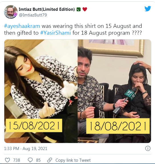 سوشل میڈیا صارفین نے تیسرا سوال یہ اٹھایا کہ جس دن عائشہ کی جانب سے 15 اکست کو اپنے انسٹاگرام اکاؤنٹ پر تصویر شئیر کی گئی اور اس میں جو قمیض انہوں نے زیب تن کی ہوئی تھی وہی شرٹ یاسر شامی نے کیوں پہن رکھی تھی؟