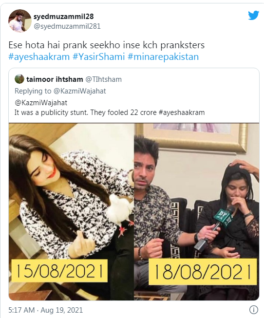 سید مزمل نامی ایک صارف لکھتے ہیں کہ ایسا ہوتا ہے پرینک کچھ سیکھو ان سے پرینکسٹر۔