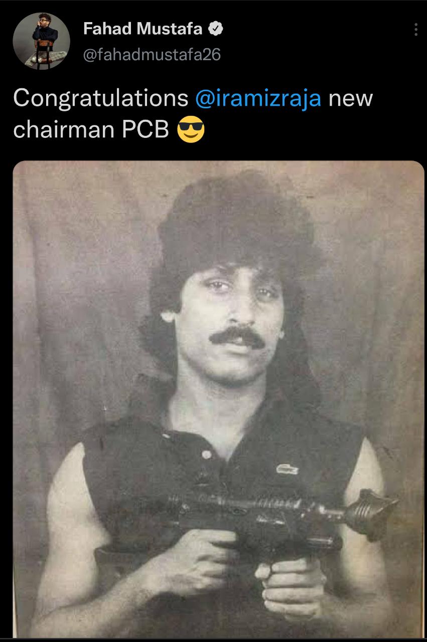 جبکہ پاکستانی مشہور اداکار فہد مصطفیٰ نے رمیز راجہ کی پرانی تصویر کے ساتھ لکھا مبارک ہو نئے پی سی بی چیرمین۔