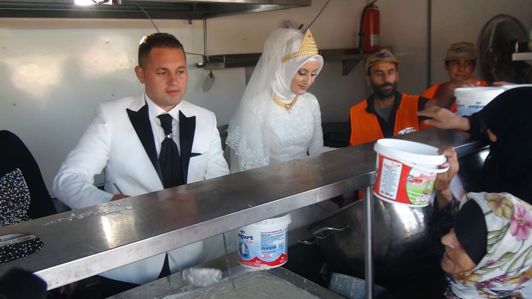 شامی مہاجرین کھانا تقسیم کرنے والے بڑے ٹرکوں کے پیچھے کھڑے تھے۔ جوڑے نے فیصلہ کیا تھا کہ روایتی ضیافت کے استقبال کے لیے اپنے دوستوں اور اہل خانہ کی میزبانی کرنے کے بجائے وہ خانہ جنگی کے متاثرین کو کھانا کھلائیں گے۔