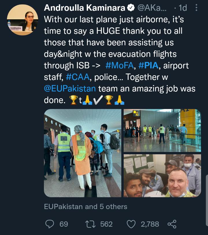 جبکہ یورپی یونین کی سفیر ایندرولا کامینارا نے ٹوئیٹ کرتے ہوئے پی آئی اے کا شکریہ ادا کیا اور کہا کہ پی آئے اے کا شکریہ، جنہوں نے ہمیں اسلام آباد تک پہنچانے کے لیے دن رات ایک کر دیے۔