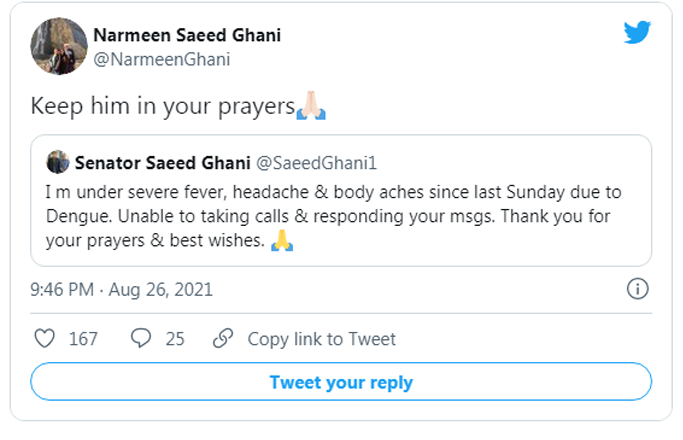 سابق وزیر تعلیم سندھ سعید غنی نے اپنے ٹوئٹر پیغام میں کہا کہ طبعیت کی خرابی کے باعث وہ نہ تو فون کالز سن سکتے ہیں اور نہ ہی موصول ہونے والے پیغامات کے جواب دینے کی پوزیشن میں ہیں۔