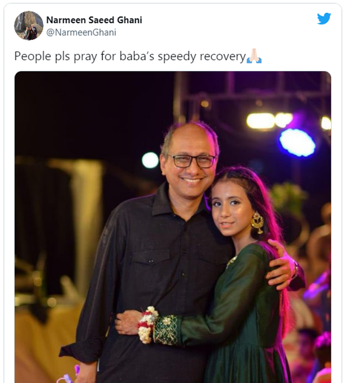ذرائع کے مطابق سعید گنی کی صاحبزادی نرمین نے والد کے ہمراہ سوشل میڈیا سائٹ ٹوئٹر پر ایک تصویر شیئر کی،انہوں نے شئیر کردہ تصویر کے کیپشن میں لکھا کہ براہِ کرم میرے والد کی جلد صحتیابی کیلئے دعا کریں۔