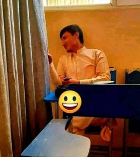 اس تصویر کو بھی سوشل میڈیا صارفین بھرپور شئیر کر رہے ہیں اور پردے سے جھانکتے ہوئے ایک طالبِ علم کی یہ تصویر بھی خوب وائرل ہو رہی ہے۔