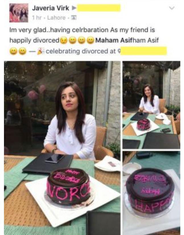 چند دن پہلے سوشل میڈیا پر جویریہ ورک نے اپنی سہیلی ماہم آصف کی طلاق کو سیلیبریٹ کرتے تصویر ڈالی جس میں ایک کیک بھی موجود تھا جس پر ہیپی ڈائیورس لکھا ہوا تھا۔ ماہم کی تصویر اور انھیں ہنستے مسکراتے طلاق سیلیبری کرتے دیکھ کر سوشل میڈیا صارفین نے ان کی ہمت کو سراہا اور کہا کہ کبھی کبھی ایک برے رشتے سے اکیلا رہنا زیادہ بہتر ہوتا ہے۔