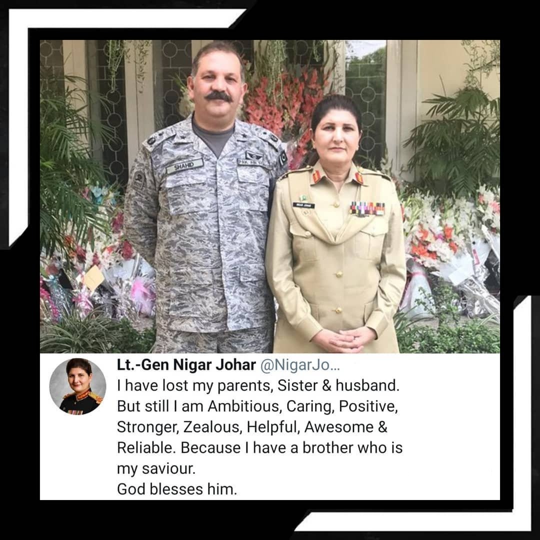 میجر جنرل نگار جوہر نہ صور پاکستان کا فخر ہیں بلکہ اپنی ذات میں ایک کہکشاں ہیں۔ حال ہی میں مینٹل ہیلتھ ایکٹیویسٹ خولہ گوہر نے اپنے انسٹاگرام اکاؤنٹ پر جنرل نگار جوہر کے ساتھ تصویر اور تفصیلی پوسٹ شئیر کرتے ہوئے لکھا کہ “انھوں نے ایم سی کو ابھی جوائن ہی کیا تھا اور ایک نوجوان اور خوبصورت کپتان بنی تھیں۔ یہ وقت کسی بھی انسان کی زندگی کا حسین ترین موڑ ہوتا ہے لیکن اسی وقت اچانک ان کے ماں باپ اور دو بہن بھائی کار ایکسیڈینٹ میں انتقال کرگئے۔ اور ان کے ساتھ صرف ایک چھوٹا بھائی رہ گیا جس کی دیکھ بھال کی ذمہ داری اب نگار جوہر پر تھی۔“