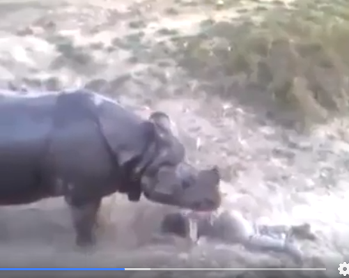 ویڈیو میں دیکھا جا سکتا ہے کہ لوگ گینڈے کو نوجوان کے پاس سے ہٹانے کی کوششیں کر رہے تھے مگر گینڈا اس نوجوان مارنے کے در پر تھا۔ لوگوں کی جانب گینڈے کو مختلف طریقوں سے دور بھگانے کی کوشش کی جا رہی تھی، مگر گینڈا اس جگہ سے ہٹنے کو تیار نہیں تھا۔