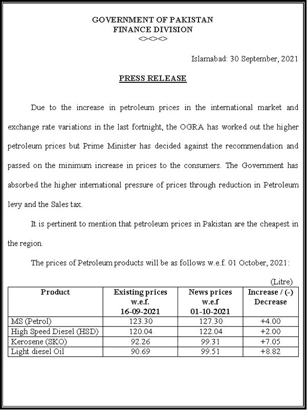 اعلامیے کے مطابق ہائی اسپیڈ ڈیزل کی قیمت میں 2روپے فی لیٹر،مٹی کے تیل کی قیمت میں 7 روپے 5 پیسے جب کہ لائٹ ڈیزل آئل کی قیمت میں 8 روپے 82 پیسے فی لیٹر اضافہ کیا گیا ہے۔
