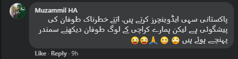 اوپر موجود مزاحیہ پوسٹ پر ایک مزمل نامی صارف لکھتے ہیں کہ "پاکستانی صحیح ایڈوینچرز کرتے ہیں۔ اتنے خطرناک طوفان کی پیشگوئی ہے لیکن ہمارے کراچی کے لوگ طوفان دیکھنے سمندر پہنچے ہوئے ہیں۔