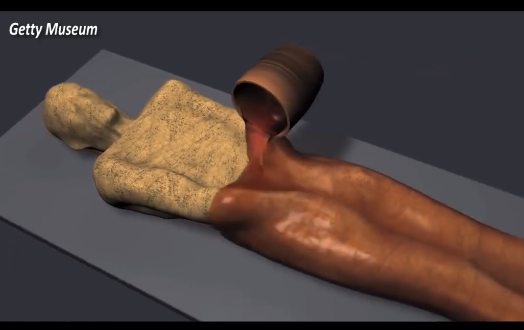 40 دن بعد وہ جسم جس پر نمک کی تہہ چڑھائی ہوتی ہے، جب اسے نکالا جاتا ہے تو سوکھ چکا ہوتا ہے، یعنی دھنس چکا ہوتا ہے۔ پھر اس جسم پر پرفیوم آئل لگایا جاتا ہے اور پلانٹ ریزنس لگایا جاتا ہے۔ اس کے بعد ریزنس کی ایک موٹی تہہ لگائی جاتی ہے، جو کہ گلو کا کام کرتی ہے۔ اس طرح ممیفیکیشن کا آدھا کام مکمل ہو جاتا ہے۔