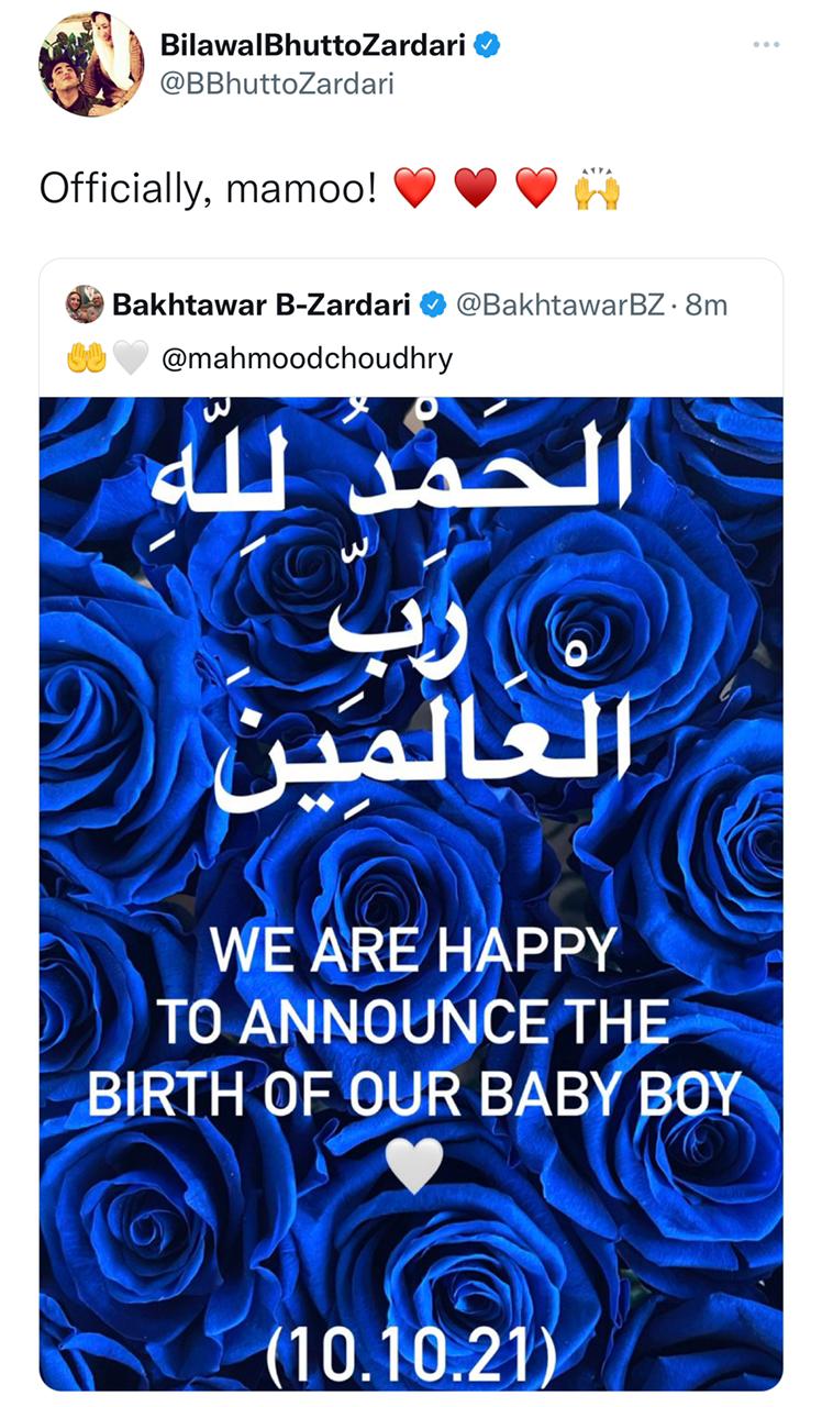 مزید یہ کہ تصویر کو شیئر کرتے ہوئے لکھا کہ میں آج سے ماموں بن گیا ہوں۔اور ساتھ ہی ساتھ انہوں نے اس خوشی کے لمحہ میں بختاور بھٹو کے خاوند چوہدری محمود کو بھی اپنی اس پوسٹ میں ٹیگ کر کے شریک کیا۔