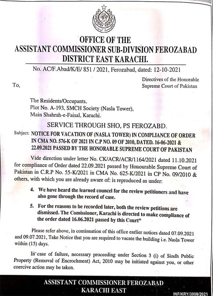 کراچی کی ضلعی شرقی انتظامیہ نے نسلہ ٹاور کے رہائشیوں کو 27 اکتوبر تک بلڈنگ خالی کرنے کا نوٹس جاری کردیا گیا ہے۔