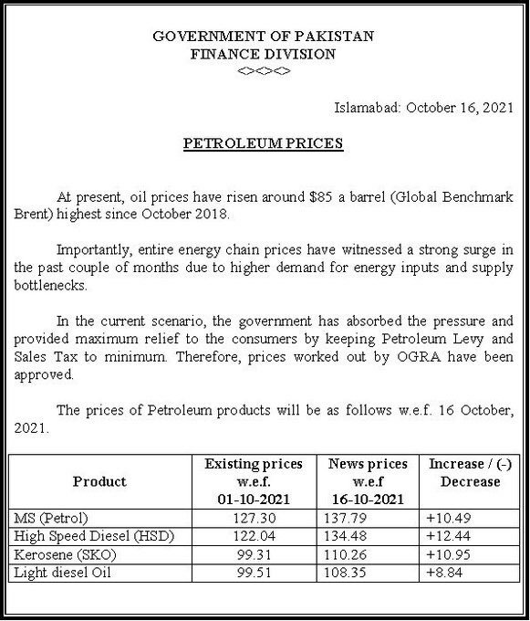 پچھلے کئی دنوں سے پیٹرولیم مصنوعات کی قیمتوں میں اضافے کی خبریں سامنے آرہی تھی، جن میں پیٹرول کی قیمت میں 5 سے 7 روپے کے درمیان بڑھنے کا امکان ظاہر کیا جارہا تھا۔ لیکن آج صبح جاری ہونے والے نوٹیفکیشن کے مطابق پیٹرول کی فی لیٹر قیمت 10.49 پیسے اضافے کے بعد 137.47 پیسے ہوگئی ہے۔