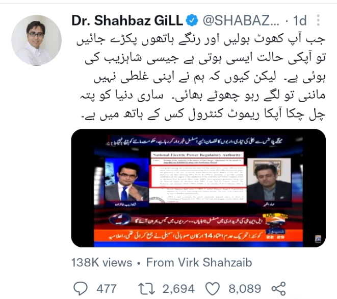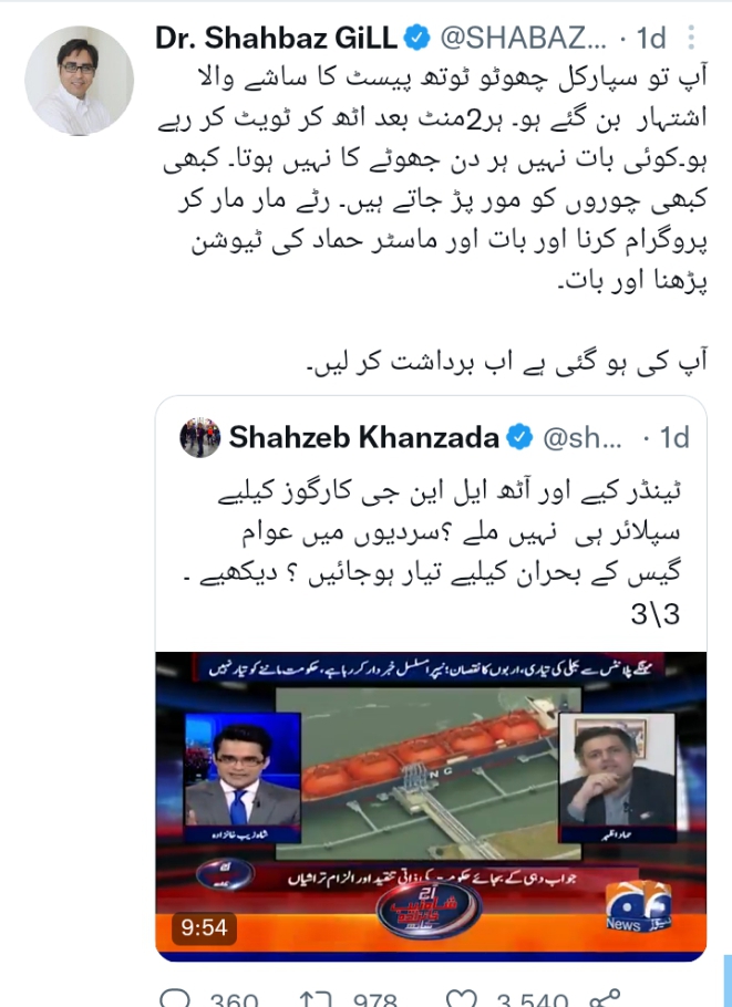 ڈاکٹر شہباز گل جو پی ٹی آئی کے مشیر ہیں انھوں نے بھی اس موقع پر شاہ ذیب خانزادہ کو آڑے ہاتھوں لیا۔ شہباز گل نے شاہ ذیب اور حماد اظہر کی ہونے والی بحث کو ٹوئٹ کرتے ہوئے لکھا کہ “ ساری دنیا کو پتا ہے کہ آپ کا ریموٹ کنٹرول کس کے ہاتھ میں ہے۔ جب آپ جھوٹ بولیں اور پکڑے جائیں تو آپ کی حالت ایسی ہی ہوتی ہے جیسی شاہ ذیب کی ہوئی ہے۔ لیکن اپنی غلطی تو ماننی ہی نہیں تو لگے رہو“