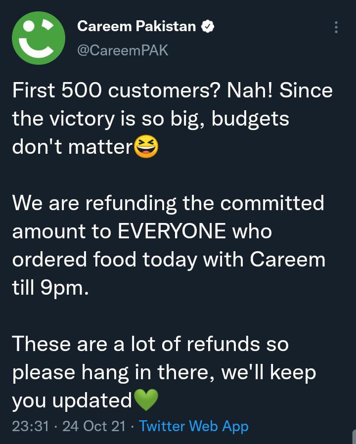 رات 9 بجے تک جس جس نے آرڈر کیے تھے، ان کے پیسے ری فنڈ کیے جا رہے ہیں۔ کریم کے اس عمل نے ہر ایک کو کریم کا دیوانہ ضرور بنا دیا ہے۔