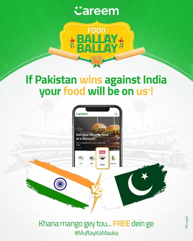 دراصل معاملہ کچھ یوں ہے کہ کریم کی جانب سے پاکستان اور بھارت کے میچ کے موقع پر ایک آفر دی گئی تھی،اس آفر کے مطابق اگر آج پاکستان بھارت سے یہ میچ جیت جاتا ہے تو آج کا کھانا کریم کی جانب سے دیا جائے گا۔
