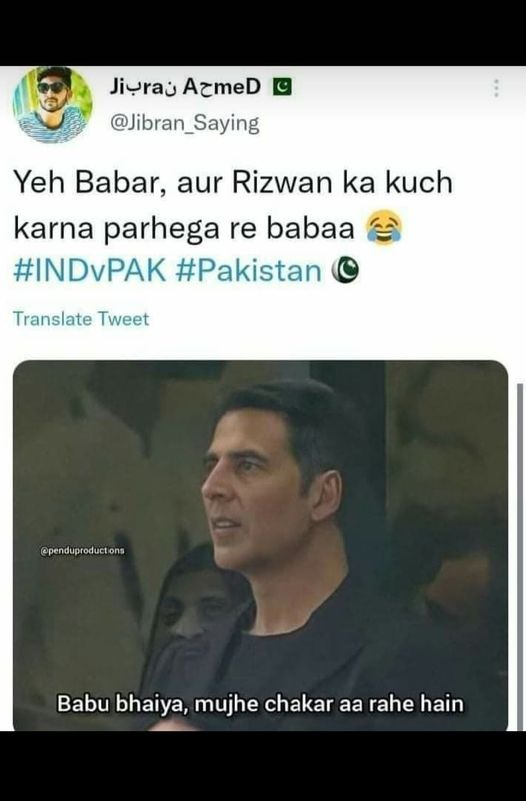 اسٹیڈیم میں بھارت کو سپورٹ کرتے اکشے کمار کی اس وقت ہوائیاں اڑنے لگیں جب بھارت کے ہاتھ سے میچ جاتا نظر آیا۔ اکشے کے چہرے کی اڑی رنگت کو دیکھ کر پاکستانیوں نے جھٹ میم بنا لیا۔