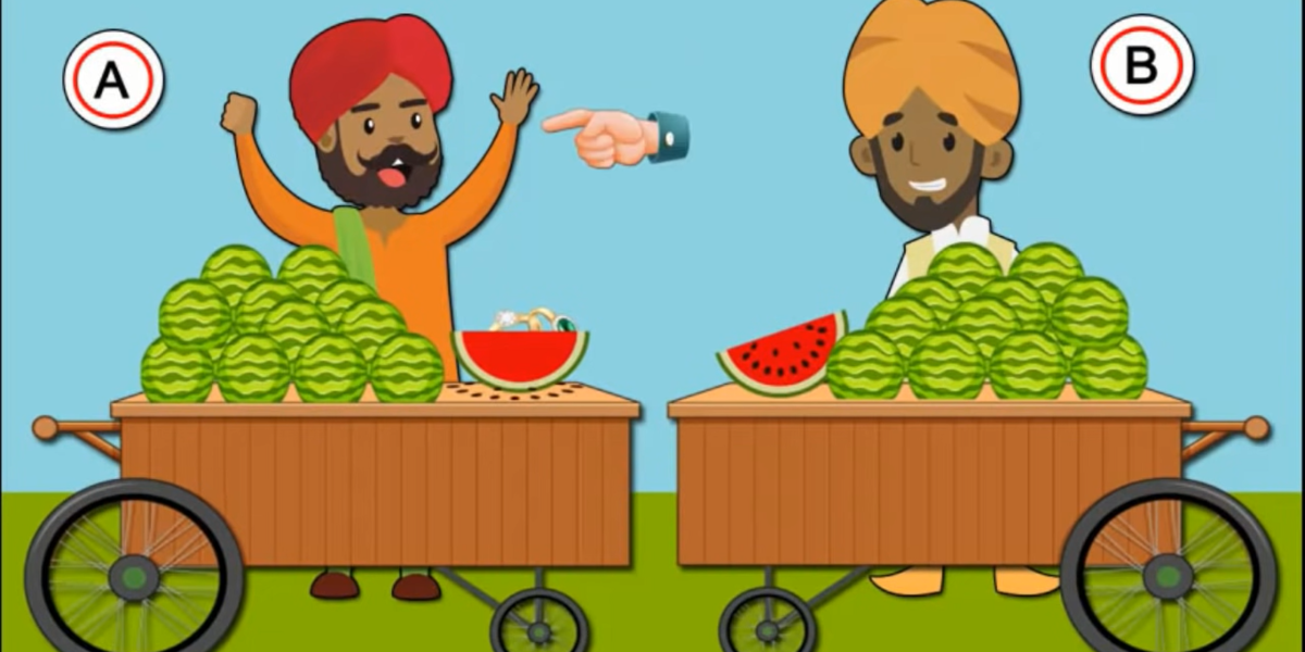 اوپر موجود تصویر میں 2 شخص تربوز فروخت کر رہے ہیں جن میں سے ایک ایماندار جبکہ دوسرا چور ہے۔