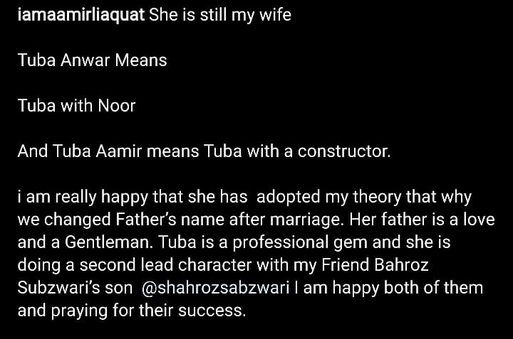 انہوں نے لکھا کہ طوبیٰ انور کا مطلب طوبیٰ نور ہے۔ ساتھ میں عامر لیاقت نے بتایا کہ طوبیٰ، شہروز سبزواری کے ساتھ ڈرامے میں کام کررہی ہیں۔