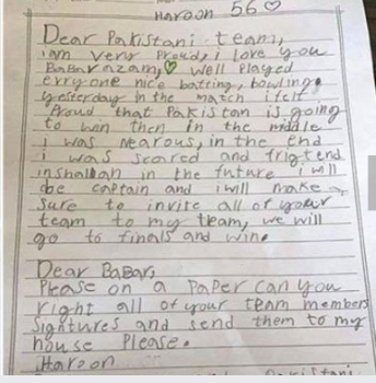 نام کے بچے نے کپتان بابر اعظم کو اپنے ہاتھ سے ایک خط لکھا جو اس وقت سوشل میڈیا پر وائرل ہے۔ خط میں ہارون لکھتے ہیں کہ "میچ دیکھتے ہوئے مجھے یقین تھا کہ ہم فائنل میں جائیں گے لیکن پھر میں پریشان ہوگیا اور جب ہماری ٹیم ہار گئی تو مجھے بہت دکھ ہوا۔"