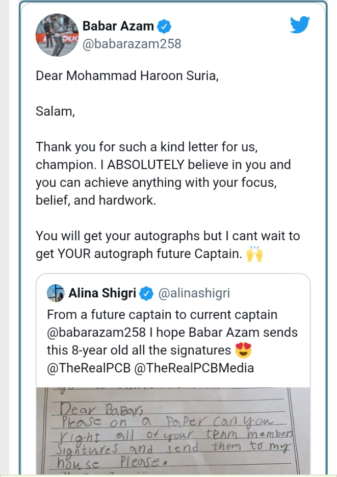 اس پیارے سے خط کے جواب میں بابر اعظم نے محمد ہارون کو جواب دیا کہ " مجھے یقین ہے کہ آپ اپنے اعتماد اور توجہ سے سب کچھ حاصل کرسکتے ہیں،آپ کو ٹیم کے آٹو گراف ملیں گے لیکن مجھے آپ کا آٹو گراف چاہیے"