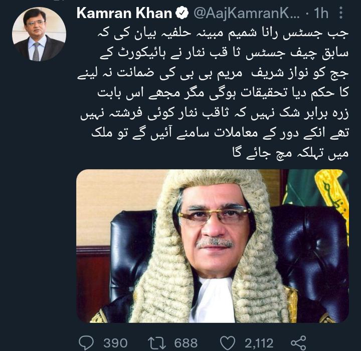 صحافی کامران خان کی جانب سے کہا گیا ہے کہ جب جسٹس رانا شمیم مبینہ حلفیہ بیان کی کہ سابق چیف جسٹس ثا قب نثار نے ہائیکورٹ کے جج کو نواز شریف مریم بی بی کی ضمانت نہ لینے کا حکم دیا تحقیقات ہوگی مگر مجھے اس بابت زرہ برابر شک نہیں کہ ثاقب نثار کوئی فرشتہ نہیں تھے انکے دور کے معاملات سامنے آئیں گے تو ملک میں تہلکہ مچ جائے گا