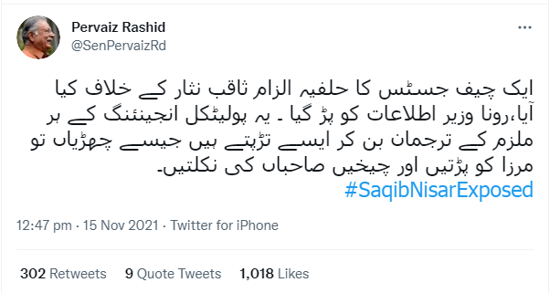 جبکہ سابق وزیر اطلاعات اور مسلم لیگ ن کے رہنما پرویز رشید کا کہنا تھا کہ ایک چیف جسٹس کا حلفیہ الزام ثاقب نثار کے خلاف کیا آیا، رونا وزیر اطلاعات کو پڑ گیا ۔ یہ پولیٹکل انجینرئنگ کے ہر ملزم کے ترجمان بن کر ایسے تڑپتے ہیں جیسے چھڑیاں تو مرزا کو پڑتیں اور چیخیں صاحباں کی نکلتیں۔'