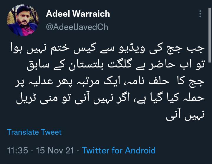 لیکن ایک اور صارف کا کہنا تھا کہ جب جج کی ویڈیو سے کیس ختم نہیں ہوا تو اب حاضر ہے گلگت بلتستان کے سابق جج کا حلف نامہ، ایک مرتبہ پھر عدلیہ پر حملہ کیا گیا ہے، اگر نہیں آئی تو منی ٹریل نہیں آئی۔