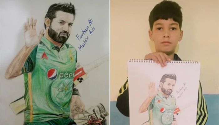 ٹیم گرین کے شاہین بھلے ہی ورلڈ کپ نہ جیت سکے لیکن اپنی شاندار کارکردگی سے پوری قوم کے دل ضرور جیت لئے ہیں۔ خاص طور پر پاکستانی بچے اس وقت کرکٹرز کو اپنے آئیڈیل کے طور پپر دیکھ رہے ہیں۔ حال ہی میں فرحان علی مچولوی نام کے ایک بچے نے محمد رضوان کی ایک خوبصورت پینٹنگ بنائی ہے۔