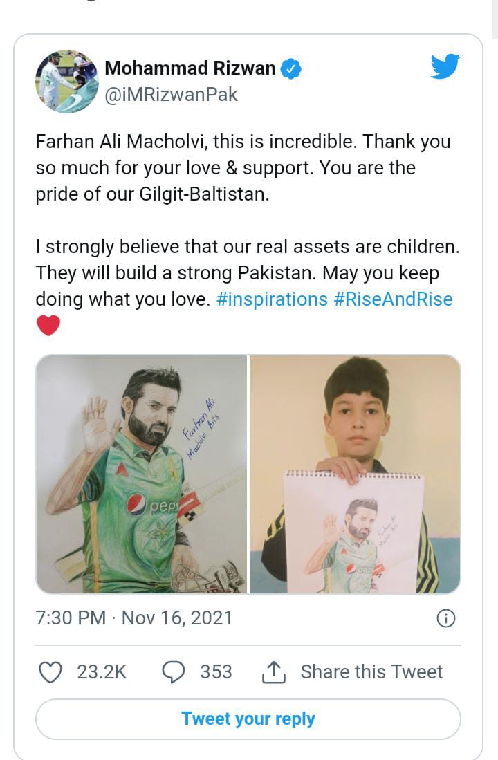 محمد رضوان نے بچے کو سراہتے ہوئے کہا کہ “آپ گلگت بلتستان کا فخر ہیں۔ آپ زندگی میں جو کرنا چاہتے ہیں وہ کریں۔ میرا یقین ہے کہ آپ جیسے بچے ہی پاکستان کا اصل اثاثہ ہیں جو ایک مضبوط پاکستان بنائیں گے“