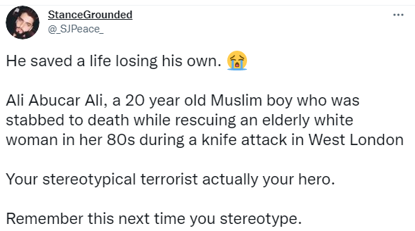 گزشتہ جمعے کے زور برطانیہ کے شہر لندن میں ایک 82 سالہ بوڑھی خاتون پر کچھ افراد نے چھر اور مکوں سے حملہ کیا۔ جس پر 20 سالہ نوجوان لڑکے علی ابوکار علی نے خاتون کی جان بچانے کیلئے اپنی جان دے دی۔