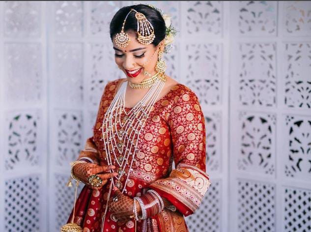 اس دلہن نے اپنی شادی پر اپنی دادی کا خوبصورت ہار پہنا ہے۔ گلے میں گلو بند اور سلک کی ساڑی کے ساتھ لمبا موتیوں کا ہار چار چاند لگا رہا ہے۔